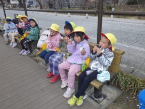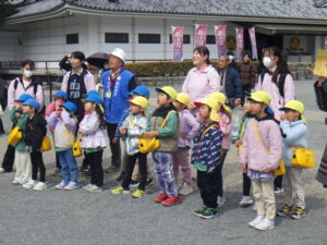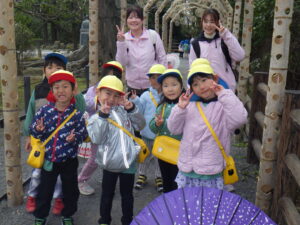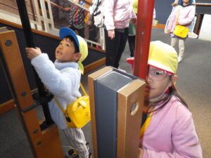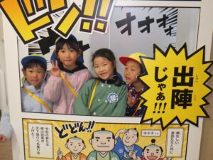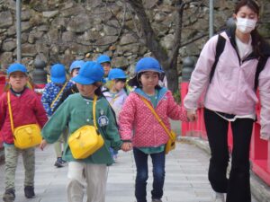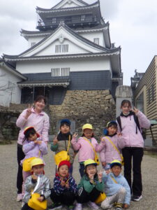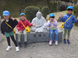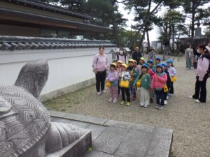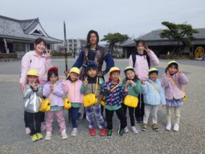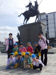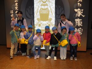 今日は、年中さんが冒険旅行をしました。場所は、岡崎公園です。名鉄電車にも自分で切符を買って乗りました。少しどきどきしましたが、電車からの景色は素晴らしかったですね。冒険旅行では、オカザえもんから出ていた指令をクリアーしていきました。最初の指令は、東岡崎駅にある「家康像」の前で写真を撮ることでした。岡崎公園では、からくり時計を見たり、武将隊の人と一緒に写真を撮ったりしました。家康館では、体験コーナーがあって、槍を持つことができたり、馬に乗ったりしました。甲冑の前での写真は、かっこよく写っていますね。岡崎城に着くと、東照公御遺訓を暗唱しました。近くで聞いていた観光客の人たちが拍手をいっぱいしてくれましたね。お城の中には、古いものがいっぱい展示してありましたね。「八丁味噌」とか「花火」など、岡崎の名産の物を見て声を出して言う子もいました。とても良い勉強になりましたね。赤い橋も渡ったし、シークレットの指令も無事クリアーできてよかったですね。みんな最後まで元気いっぱいで、楽しい冒険旅行になりました。