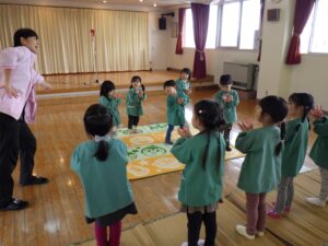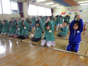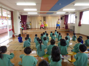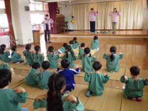 あさ、登園した来た子どもたちが、「こいのぼり」を見つけて、喜んでいました。今日は、「対面式」の日でした。年長さんと年中さんが、新しく入園してきた年少さんと仲良くする日です。年少さんは、手でチューリップの花を作って「チューリップ」の歌を楽しく歌いました。先生たちが、子どもの役になって、いろいろな約束事を守るための寸劇をしました。「あたま」「かた」「むね」「おなか」に手を当てながら、4つの約束を覚えました。最後は、先生たちがかわいいバナナに変身して、楽しい歌と踊りを見せてくれました。これから、4つの約束を守って、みんなで仲良く遊びましょうね。